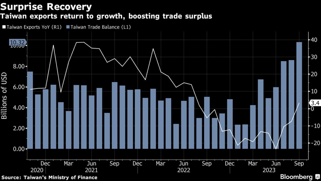 (Bloomberg) — Taiwan’s exports unexpectedly grew in September for the first time in more than a year, adding to signs that global trade is recovering.