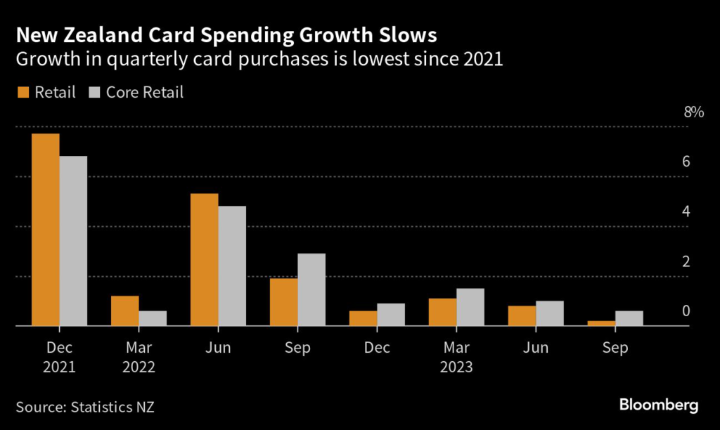 (Bloomberg) — New Zealand’s third-quarter spending on credit and debit cards rose at the slowest pace in two years as high interest rates and rising prices weighed on households.
