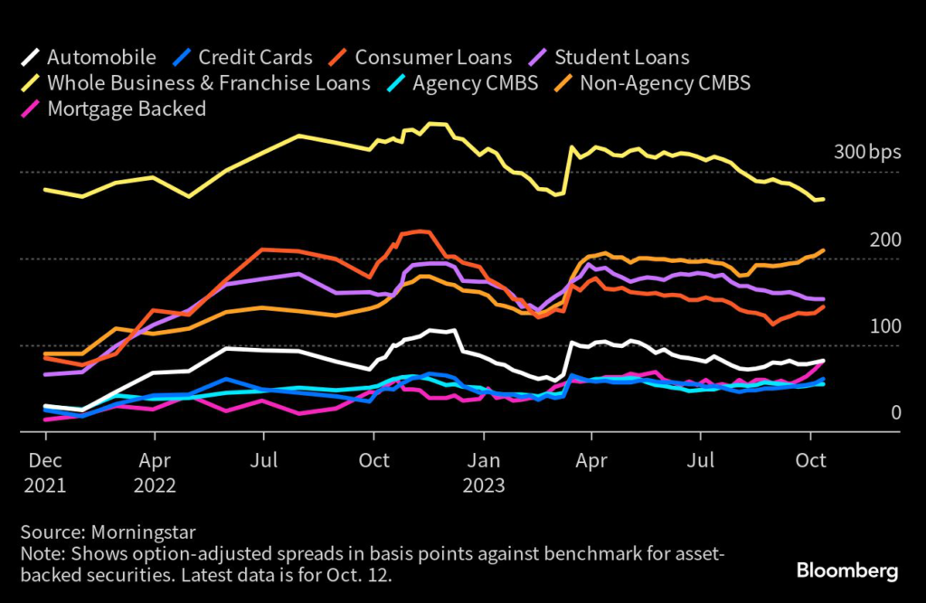 Interest rates have rallied from their highs last week but remain elevated, and there is room for cap rates to widen, thus hurting property valuations, write Barclays Plc analysts Lea Overby and Anuj Jain in a note on CMBS dated Oct.