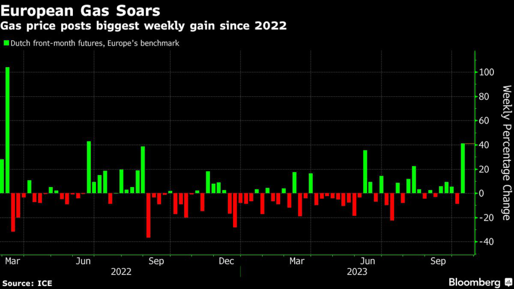 European natural gas futures posted their biggest weekly advance since last summer as the war in the Middle East escalates and a cold snap is just around the corner.