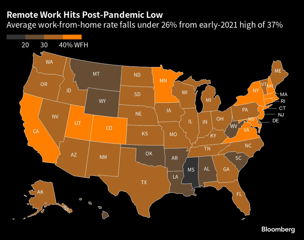 Only seven states plus Washington, DC, have a remote-work rate above 33%, the data shows, down from 31 states and DC mid-pandemic.
