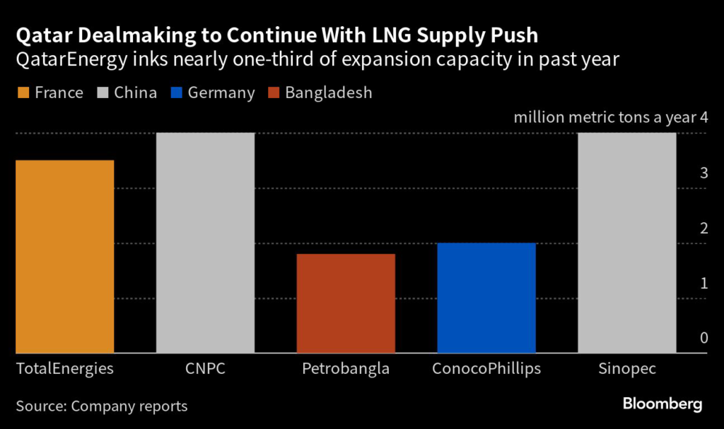 Qatar has so far contracted out about a third of its new capacity, announcing 15.3 million tons of annual LNG deals with China, Germany, Bangladesh and France.