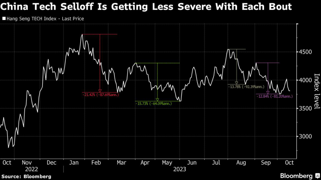 (Bloomberg) — The rout in China’s largest tech stocks is becoming less severe with each passing bout this year, signaling to some investors that confidence is slowly returning with regulatory headwinds seen to have peaked.