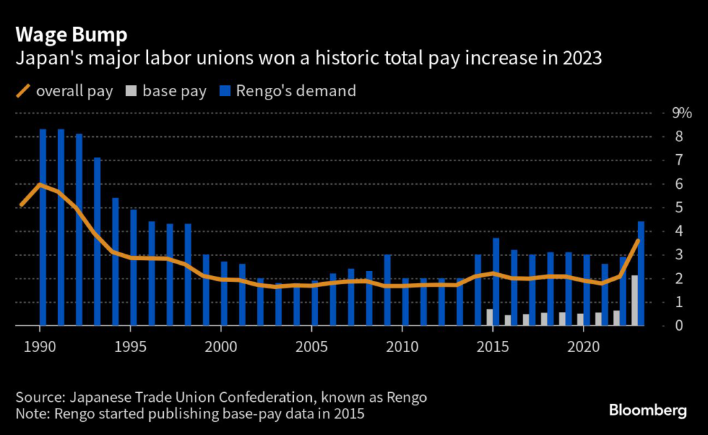 (Bloomberg) — Japan’s largest labor union federation will reportedly demand wage increases for next year that exceed this year’s historic gains, boosting the prospects for the positive growth cycle the central bank needs to see before it can pare back stimulus.