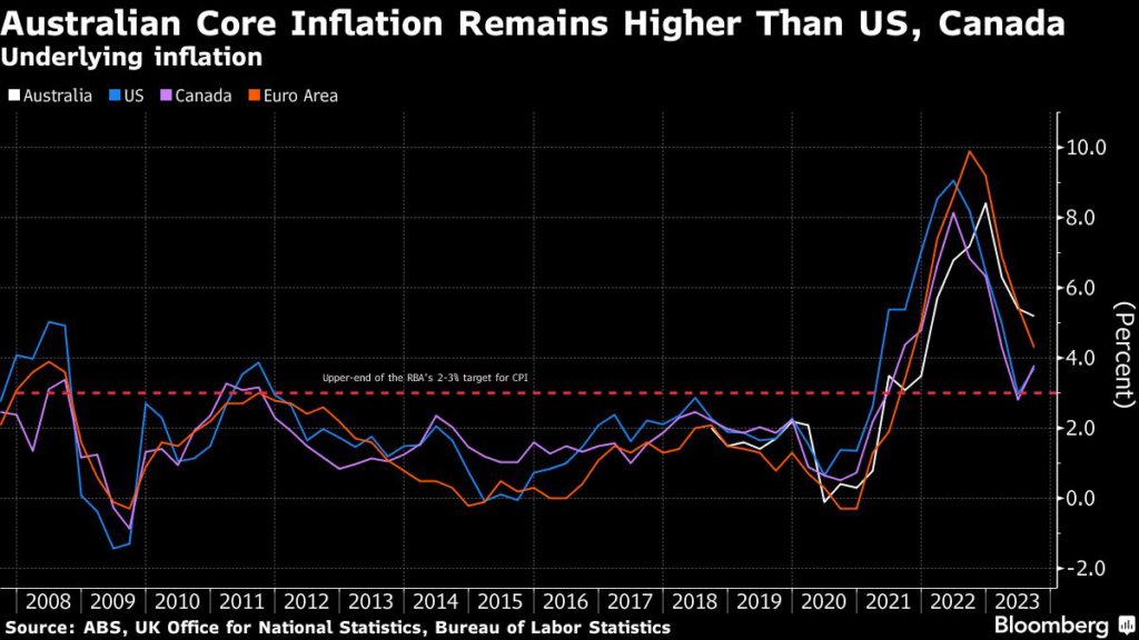 Australia’s central bank Governor Michele Bullock pointed to a series of obstacles to bringing inflation back to target that range from sticky services prices to repeated global shocks including the Israel-Hamas war.