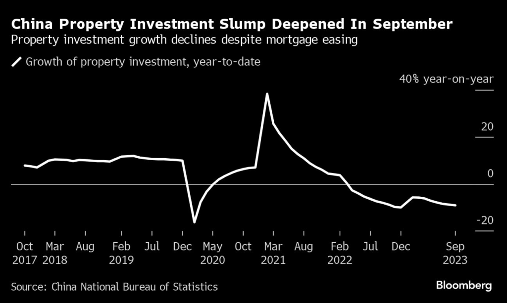 (Bloomberg) — China’s property slump remained a drag on the economy in September despite several steps taken by authorities in recent months to bolster the sector.