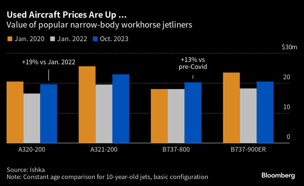 Used Boeing 737NG and Airbus A320ceo single-aisle models are now valued at about $20 million or more, according to analysts at Ishka, which specializes in aircraft pricing and valuation.