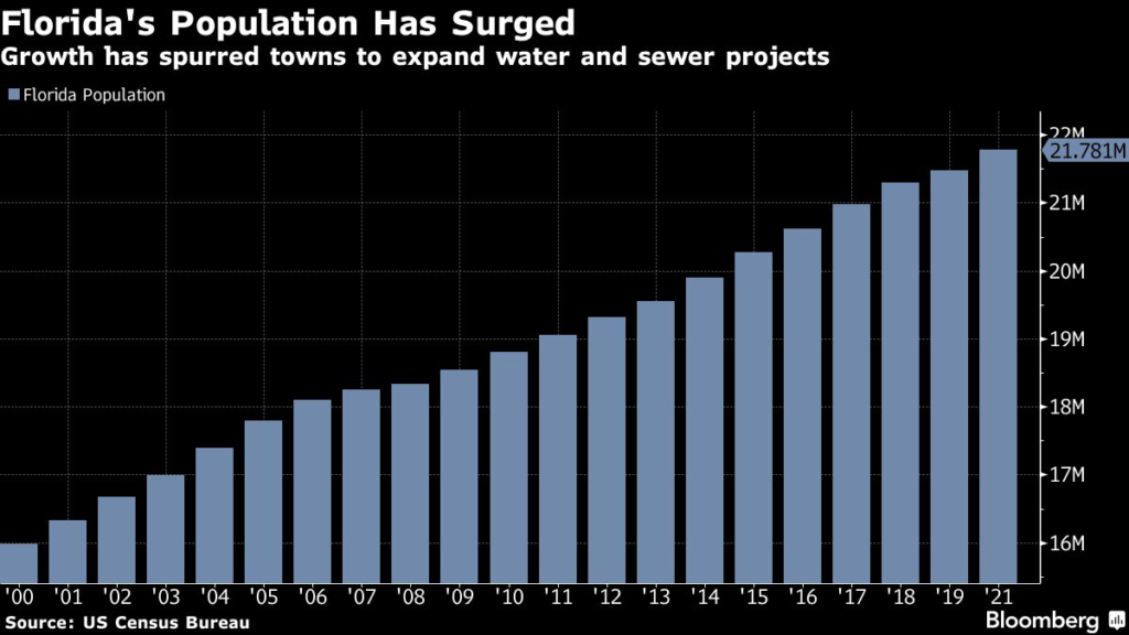 Cape Coral joins other Florida cities building and expanding water and sewer facilities to meet demand from a US migration that’s given the state the fastest-growing population in recent years.