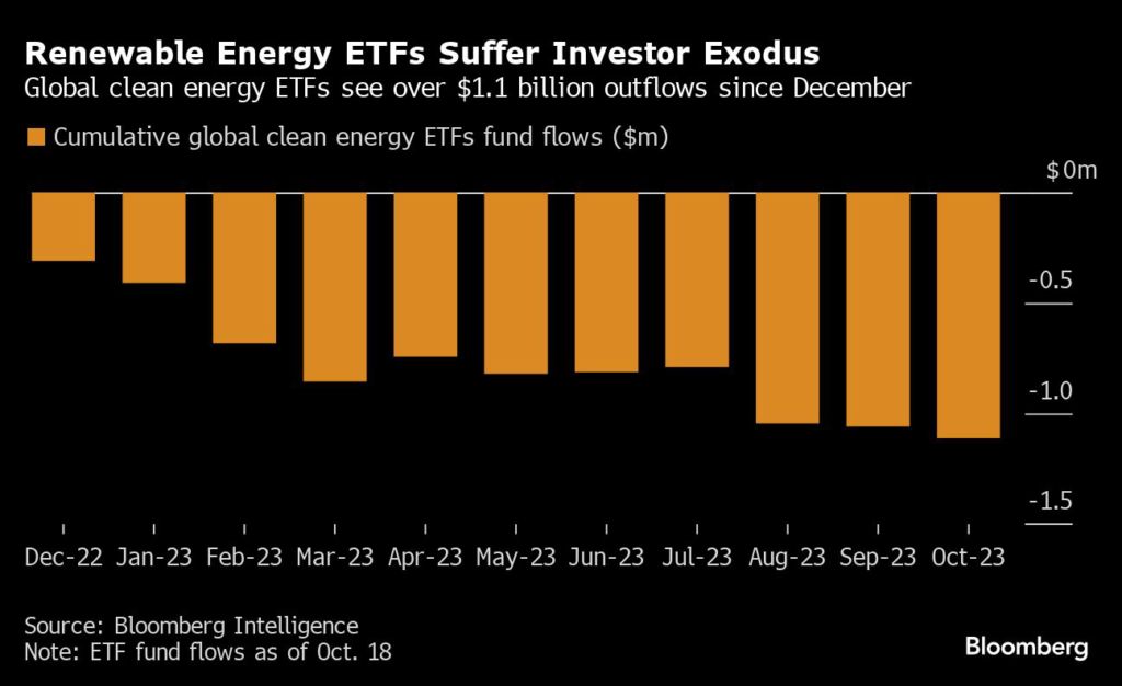 Retail investors have also fled, with global clean energy equity ETFs seeing outflows amounting to over $1.1 billion in total since December 2022.