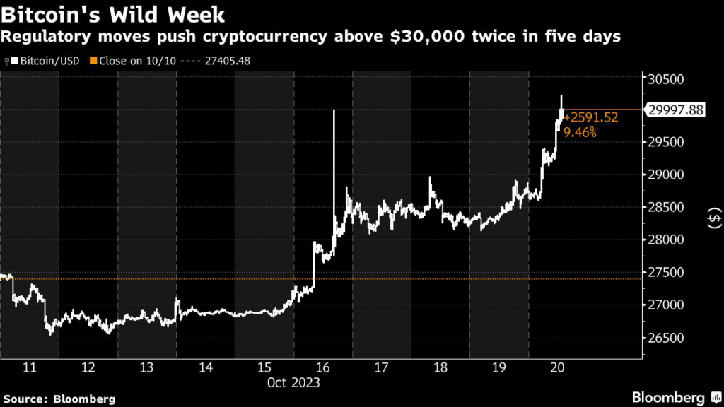 (Bloomberg) — Bitcoin briefly topped $30,000 for the second time this week on growing expectations that another favorable court action raises the likelihood than an exchange-traded fund holding the cryptocurrency will finally be approved.