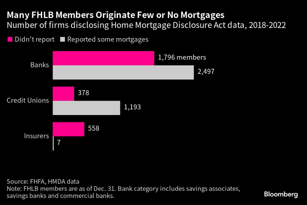 By the end of last year, 42% of the more than 6,400 banks, credit unions and insurers that could borrow from the system hadn’t reported making a single mortgage in the past five years, according to a Bloomberg News analysis of millions of home-lending records submitted to the government.
