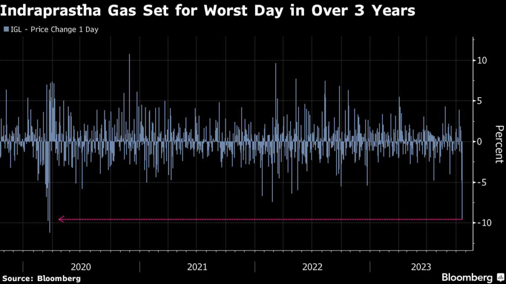 (Bloomberg) — Indraprastha Gas Ltd., India’s largest city gas distributor by revenue, is heading for its worst day in more than three years after Jefferies and Morgan Stanley downgraded the stock following a new electric vehicle policy in the national capital.