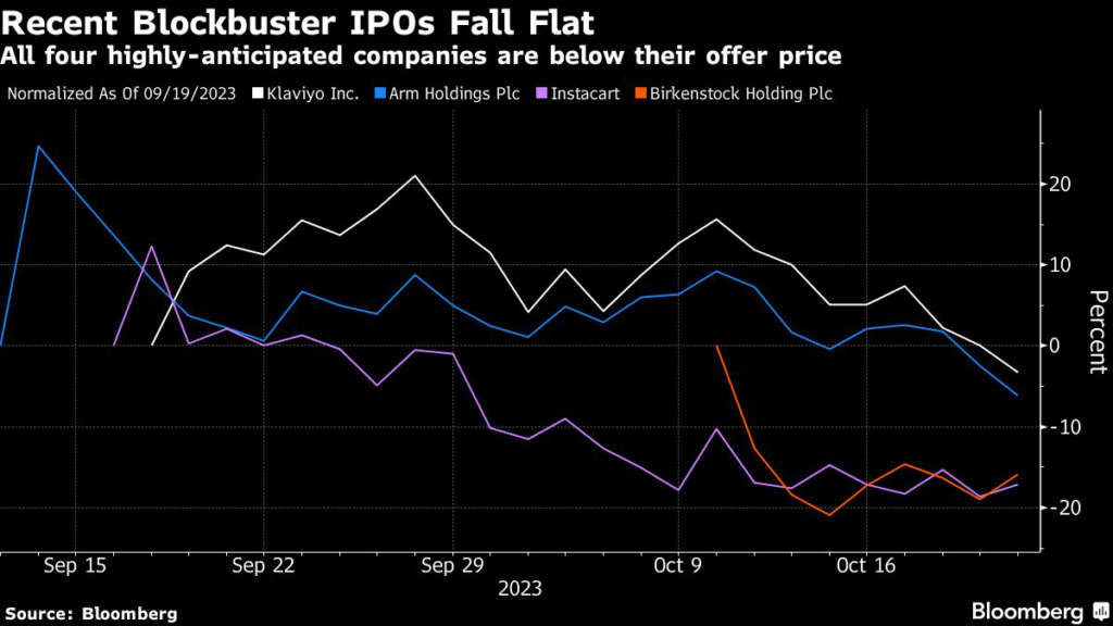 The moribund market for initial public offerings was dealt another blow as Klaviyo Inc. joined a group of closely watched companies to slump below the price at which it sold millions of shares.