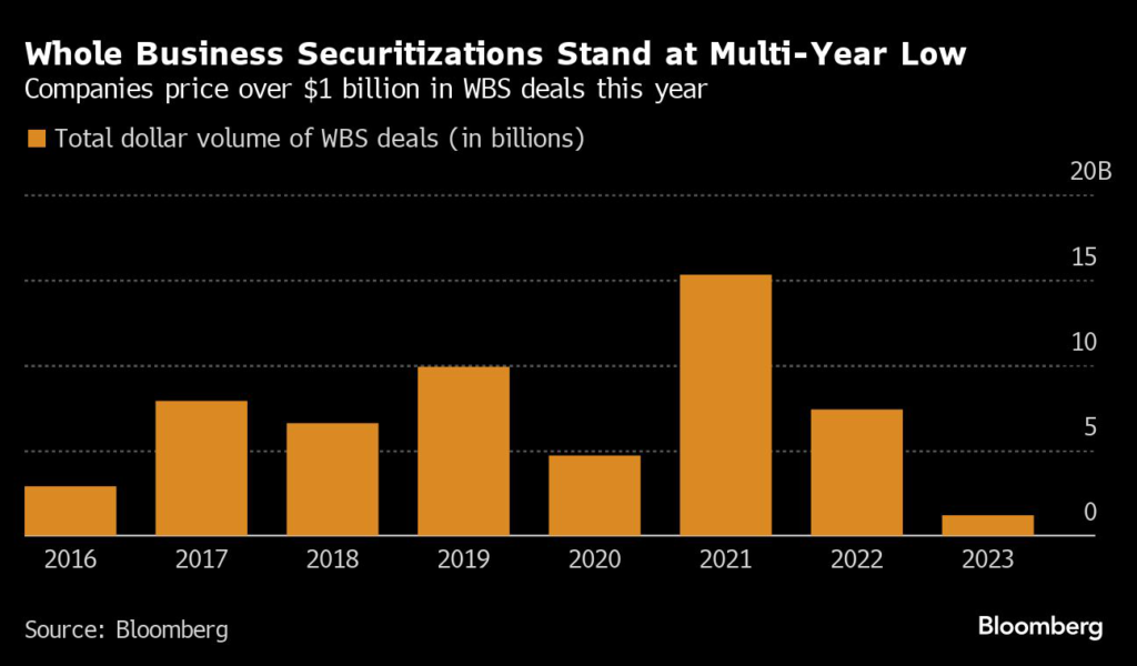 Whole business securitizations have declined since 2021, with 2023 marking the lowest deal volume since at least 2016 as issuers navigate uncertainty around interest rates, according to data compiled by Bloomberg.