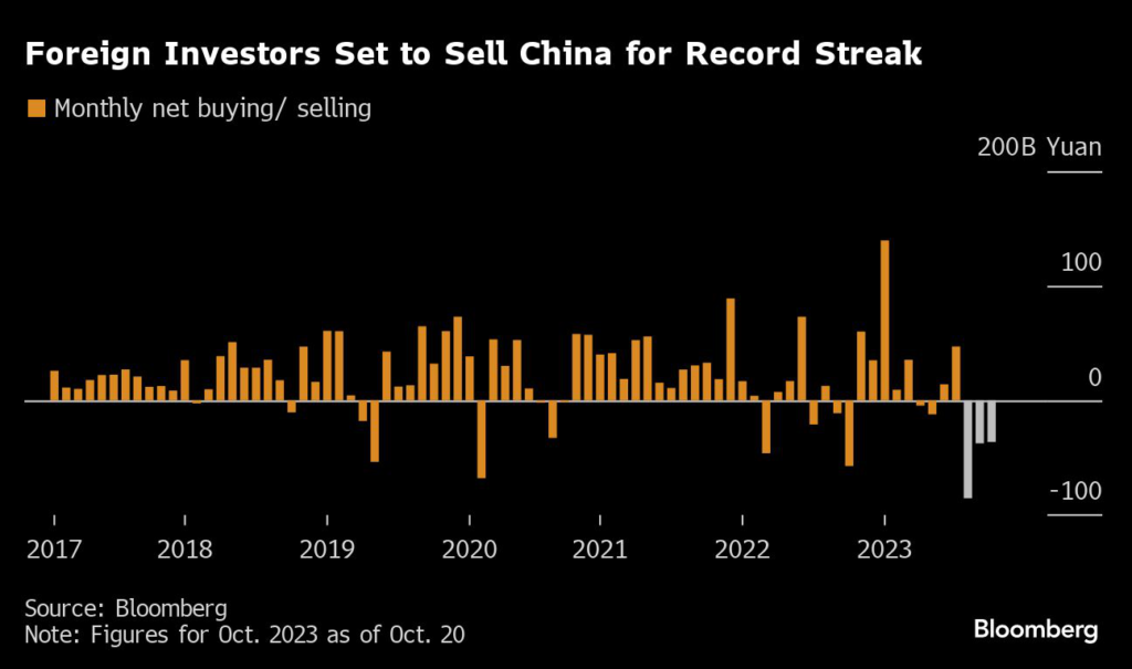 Foreign investors are now less than 70 billion yuan ($9.6 billion) away from making 2023 the first year they sell Chinese shares on a net basis since trading links opened in late 2016.