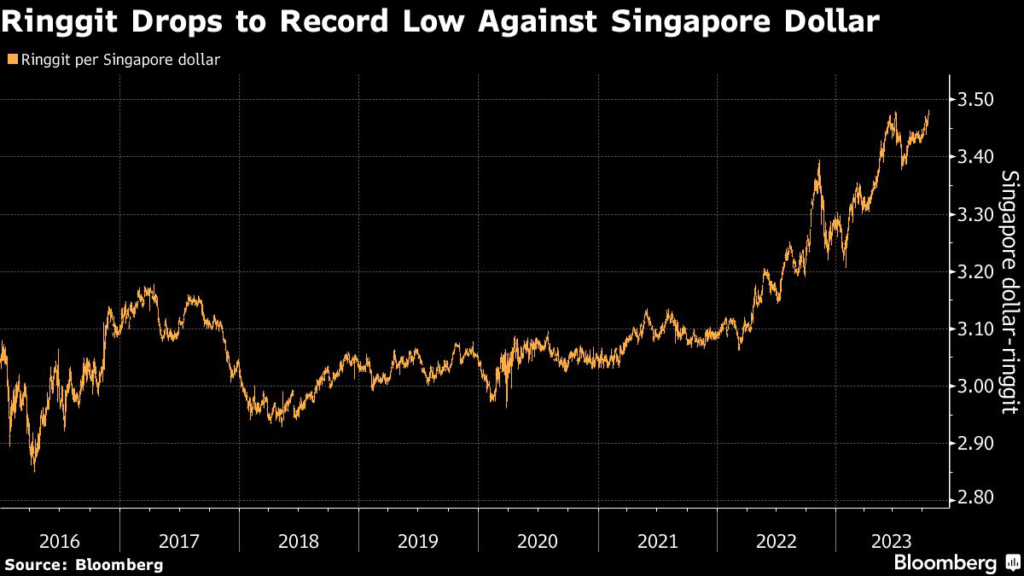 (Bloomberg) — Singapore’s dollar surged to an all-time high against the Malaysian ringgit as the latter was weighed down by weaker exports and its widening rate differential with the US.