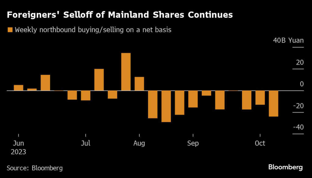 Weakness in global stocks spurred by geopolitical tensions in the Middle East worsened the pain for China’s market, with foreigners offloading 24 billion yuan ($3.3 billion) of onshore stocks on a net basis this week.