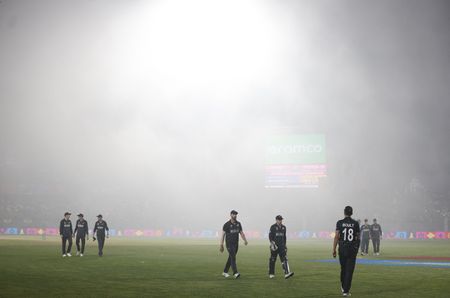 India reached 100-2 in the 15th over when heavy fog caused low visibility, forcing the players off the pitch for a while.