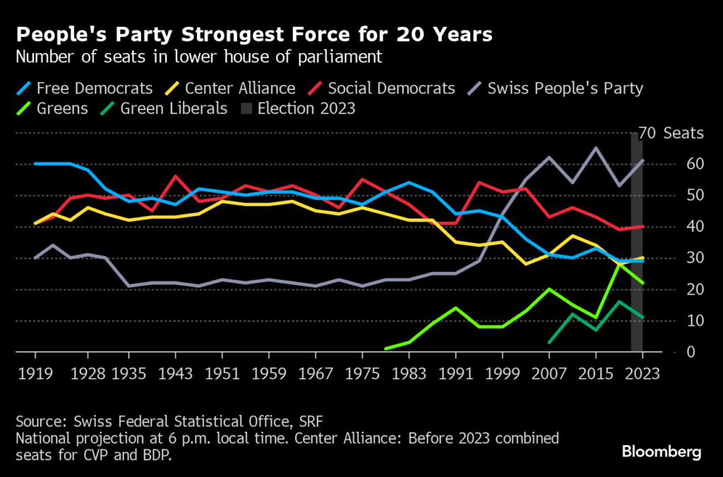 (Bloomberg) — Switzerland’s Center Alliance said it won’t challenge the Free Democrats for a second seat in the executive, even after likely winning more seats in parliament.