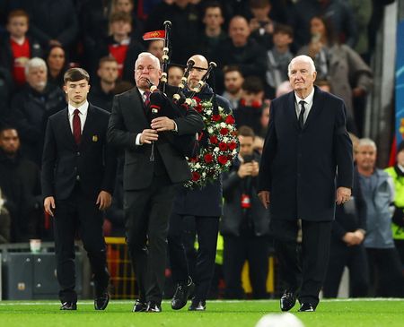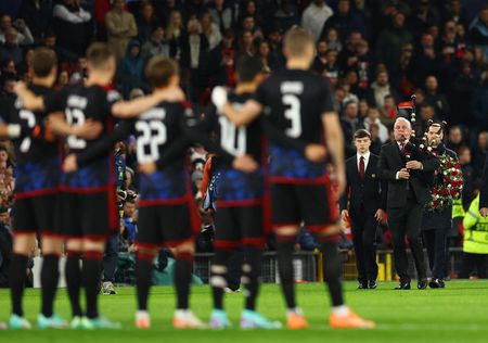 MANCHESTER, England (Reuters) – Manchester United manager Erik ten Hag laid a wreath in the centre of the storied Old Trafford pitch on Tuesday in a stirring tribute to club great Bobby Charlton ahead of their Champions League group-stage match against FC Copenhagen.
