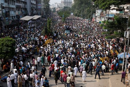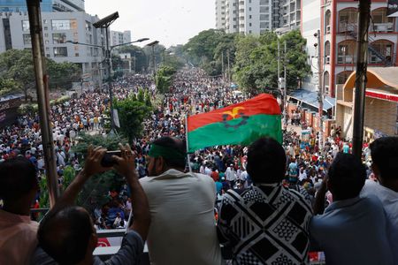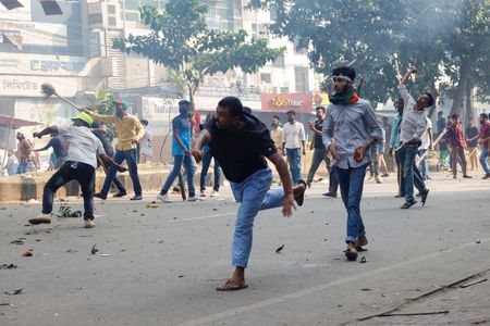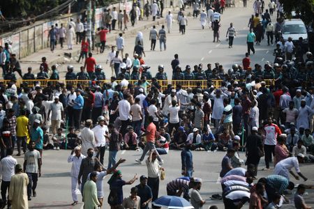 DHAKA (Reuters) -One police officer was killed in Bangladesh on Saturday and over 100 people injured during an opposition party protest demanding the resignation of Prime Minister Sheikh Hasina and calling for a free and fair vote under a caretaker government.