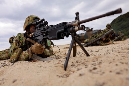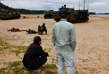 TOKUNOSHIMA, Japan (Reuters) -Japanese marines in amphibious assault vehicles stormed an island beach at the edge of the East China Sea on Sunday in a simulated attack to dislodge invaders from territory that Tokyo worries is vulnerable to attack from China.