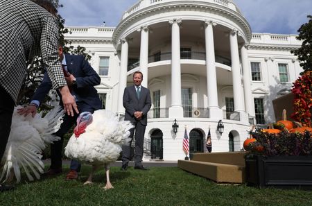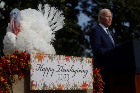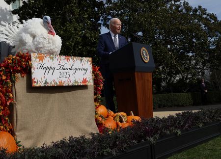 WASHINGTON (Reuters) – U.S. President Joe Biden pardoned two enormous white-plumed turkeys from Minnesota on Monday, granting Liberty and Bell freedom from Thanksgiving dinner tables as Americans prepared for their annual feasts.