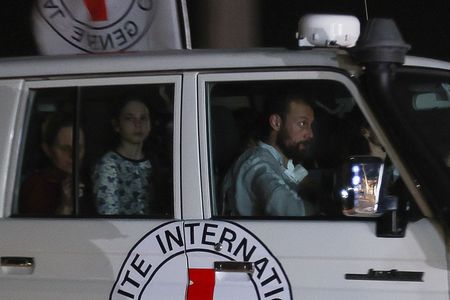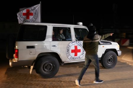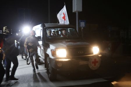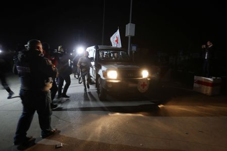 GAZA/JERUSALEM (Reuters) – Hamas handed over 13 Israeli hostages and four foreigners to the International Committee of the Red Cross on Saturday night, Qatar’s foreign ministry said, after a brief disruption earlier to the deal to free captives was overcome with the mediation of Qatar and Egypt.