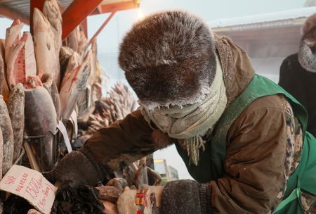 At the market in Yakutsk, fish were sold deep frozen, packed in dozens of boxes at the market.