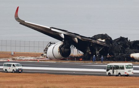 TOKYO (Reuters) -Crews at Tokyo’s Haneda Airport began clearing the charred wreck of a Japan Airlines plane from a runway on Friday, as investigators sought to retrieve its cockpit voice recorder to discover what caused its deadly collision with a Coast Guard aircraft.