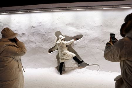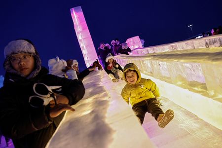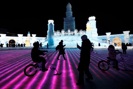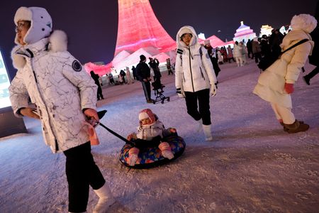 HARBIN, China (Reuters) – China’s annual Ice and Snow Festival, with its fairy-tale ice sculptures, opened on Friday attracting throngs of tourists who shuffled carefully over the slippy ice and snow and dragged their children in sledges around the park.