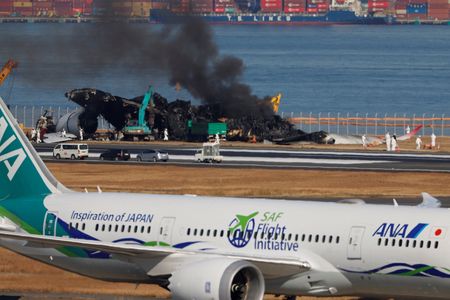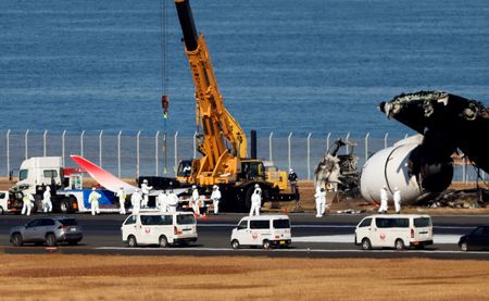TOKYO (Reuters) -Crews at Tokyo’s Haneda Airport on Friday started clearing the charred wreckage of a Japan Airlines (JAL) plane that collided with a Coast Guard turboprop on the runway on Tuesday.