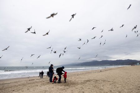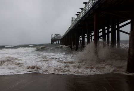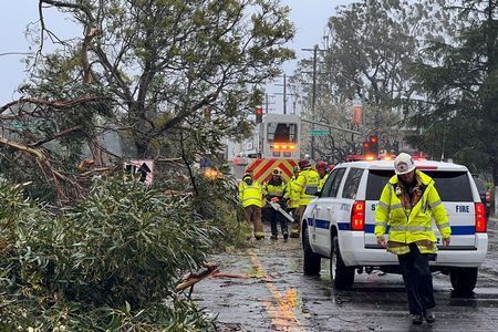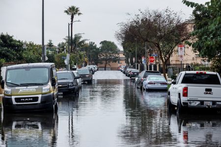 CARLSBAD, Calif. (Reuters) -Heavy rainfall and hurricane-force winds pounded much of California on Sunday, knocking out power for 900,000 customers and threatening serious floods as forecasters expect the storm to stall over major cities for the next day or two.