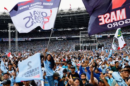 A light-blue wave took over Jakarta’s main sports complex as hundreds of thousands of Prabowo’s supporters gathered, many wearing T-shirts in his signature colour.
