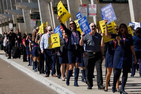 (Reuters) – Alaska Air flight attendants authorized a strike mandate for the first time in three decades, as thousands of cabin crew across three unions picketed for higher pay outside airports in the United States, the UK and Guam on Tuesday.