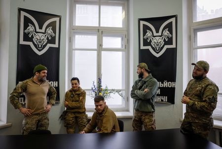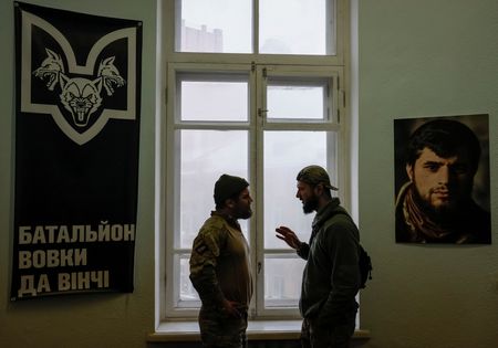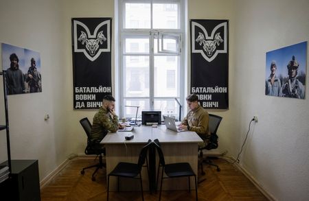 KYIV (Reuters) – A year after the founding commander of Ukraine’s Da Vinci Wolves Battalion was killed fighting Russian forces, his portrait adorns an airy new recruitment office in Kyiv casting a watchful eye over would-be members.