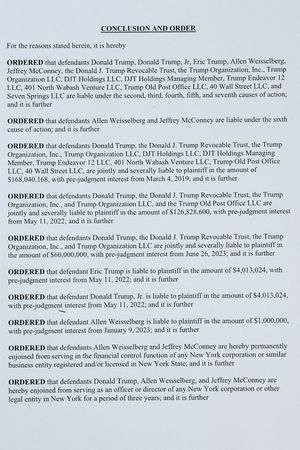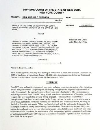 Justice Arthur Engoron, in a sharply worded decision issued after a contentious three-month trial in Manhattan, also banned Trump, who is running to regain the presidency this year, from serving as an officer or director of any New York corporation for three years.