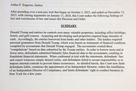 Engoron, who decided the case without a jury, also barred Trump and his companies named in the suit from applying for loans from any financial institution chartered in New York for three years, which could curtail his ability to obtain credit from major U.S.