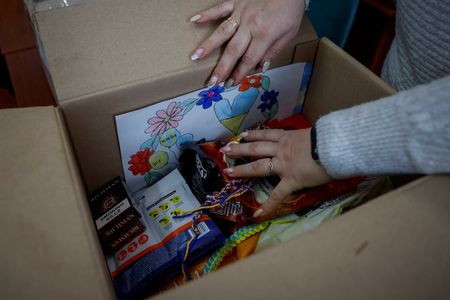 Yuliia Samotuha, another teacher at the school, coordinates the village’s volunteer effort, receiving requests from military units, dividing up the work among households and delivering goods to be packed into boxes.