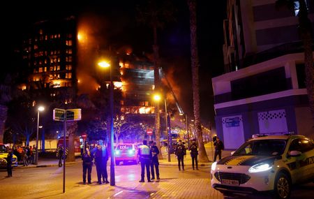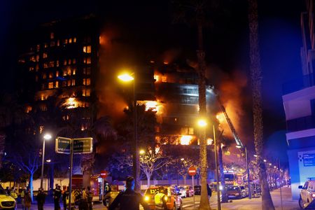 MADRID (Reuters) – Firefighters battled a blaze that engulfed an entire apartment building in the Spanish city of Valencia on Thursday, with local media reporting several residents still trapped inside.