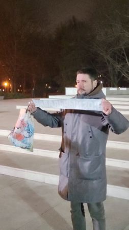 In video footage Yakov shot that night, a dozen onlookers watched silently as Vyazov clutched his sign in front of the memorial strewn with fresh flowers.