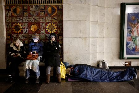 Small groups of people huddled for safety underground in a central Kyiv metro station in the early hours, some of them sleeping on camping mats.