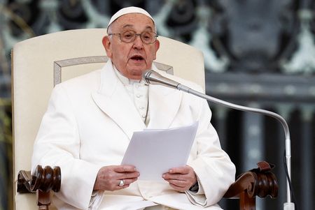 VATICAN CITY (Reuters) – Pope Francis on Wednesday issued a fresh appeal for peace in Gaza and Ukraine, deploring the killing of aid workers in an Israeli airstrike and paying tribute to a Ukrainian soldier who died in the war against Russia.
