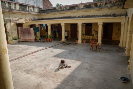 Clothes dried in the courtyard, while a washing machine beeped and a family living out of the office went about its morning chores.