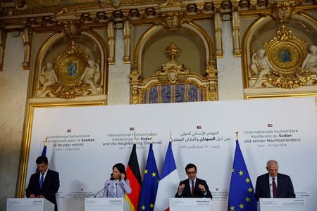 PARIS/CAIRO (Reuters) -Donors pledged more than 2 billion euros ($2.13 billion) for war-torn Sudan at a conference in Paris on Monday, French President Emmanuel Macron said, on the first anniversary of what aid workers describe as a neglected but devastating conflict.