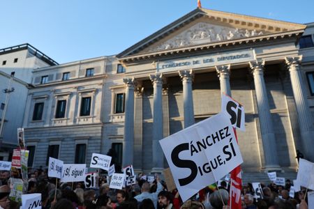 Carrying posters reading “Don’t give in” and “For the love of democracy”, about 5,000 of Sanchez’s supporters marched to the Spanish parliament to urge the prime minister to stay, according to an estimate by the Spanish government.