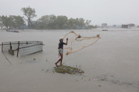 SATKHIRA, Bangladesh (Reuters) -Strong gales and heavy rain triggered by the first major cyclone of the year lashed the coastlines of India and Bangladesh on Monday, killing at least 16 people and cutting power to millions.