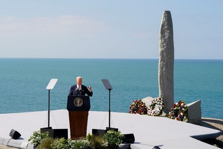 POINTE DU HOC, France (Reuters) -Atop the cliff that U.S. Army Rangers scaled 80 years ago on D-Day, President Joe Biden on Friday compared the threats posed by Nazi Germany to those facing the world today by dictators and authoritarianism, and urged Americans to resist isolationism.