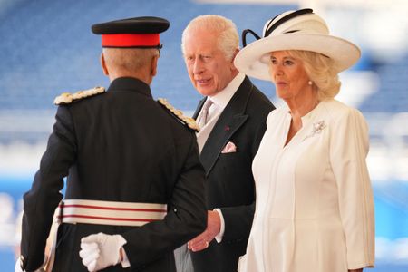 The two heads of state, Charles wearing a top hat, then inspected the Guard of Honour as the rows of soldiers in their traditional scarlet uniforms and black bearskin hats stood in the summer heat.