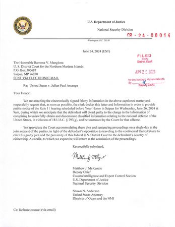 Assange, 52, has agreed to plead guilty to a single criminal count of conspiring to obtain and disclose classified U.S.